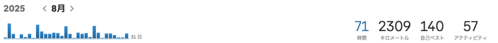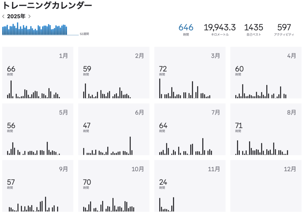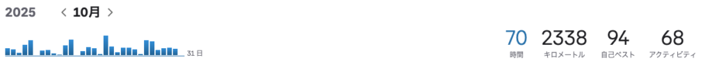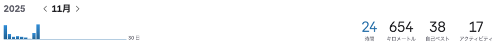 7月以降の乗り込み時間と距離は以下の通り。10月は2500-3000kmは乗り込みたかったが、9月から仕事環境が変わったこともあり、9月以降は思うようには乗り込めなかった。が、できることはやった。11月はレース当日のログも入っている。