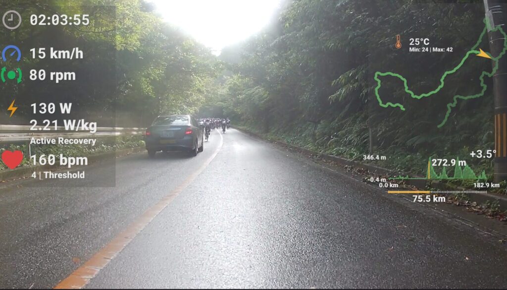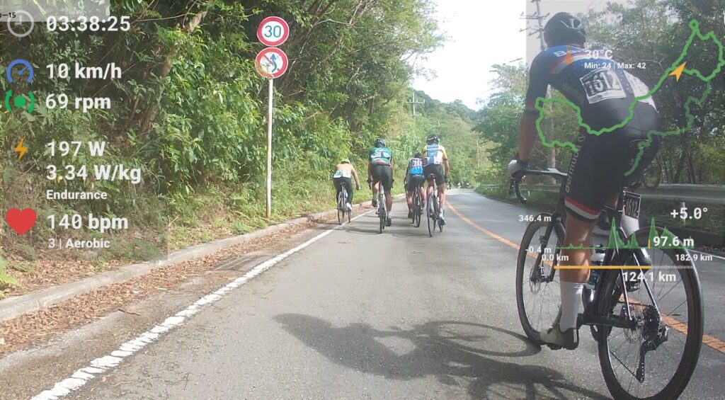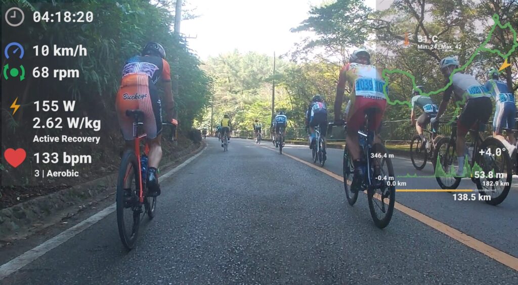 パワーも3倍程度が限界となり、「これは終わったか」と本気で思ったし、DNFこの時点でするかもがよぎった。げんたさんは集団復帰してくれ!と願うばかりだった。このとき、数年前池川さんが落車で血を流しながらも上位でゴールしたのも思い出して、自分も頑張ろうって奮い立たせた。