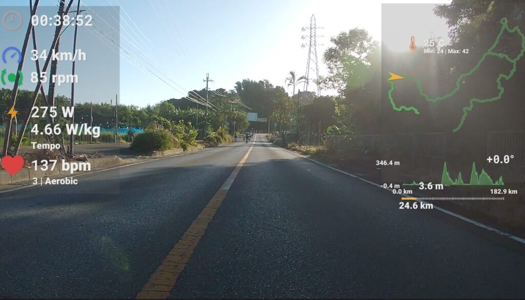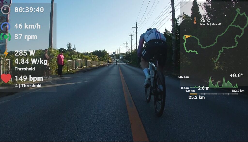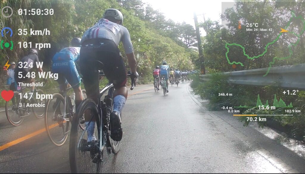 上記のための作戦だが、「余計な力は極力使わず、要所でのみ力を使うこと」である。ただ、集団の後方にいるとリスクやインターバルになる可能性が高いため、真ん中よりは前方だが、前すぎない場所をキープする動きを前半(2回目のふんがわ前まで)は取ろうと思っていた。後半はちぎり合いになると思うので、前方に位置取り、できるだけついていく、これがどこまで続くかのイメージをしていた