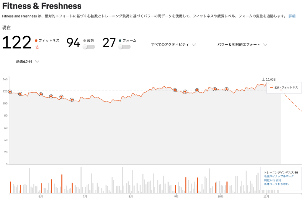 CTLとしては、レース直前週の土曜日(11/1)が最大で133まで上げて、後はテーパリングを実施し、前日の11/8(土)は124だった。