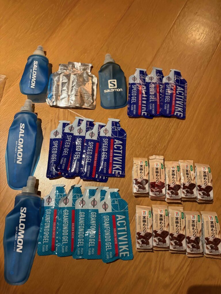 レース通して摂取したものは以下。ちぎれた後はレース強度でないので、消費量はあまり参考にならないかもだが、何持っていっていたかの備忘。消費カロリーが3000kcal位になるように計算して準備した。